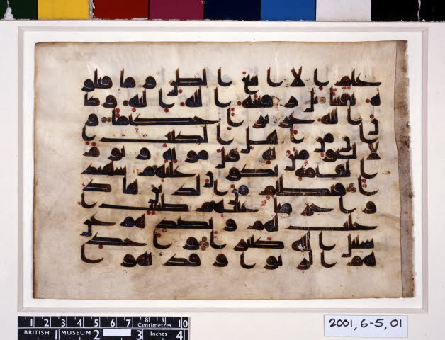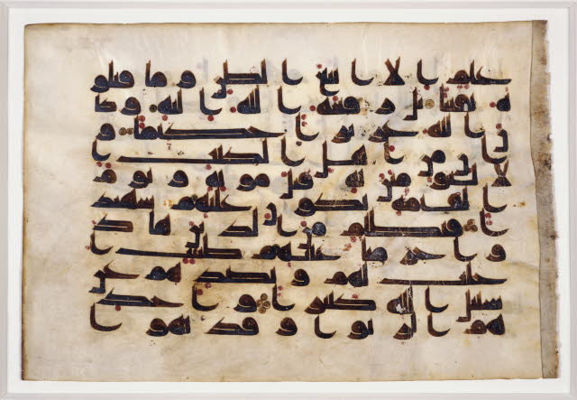 Qur'an (Koran) page (detached) with eleven lines of Kufic script in black ink on vellum recto and verso; vocalisations shown with red dots; traces of binding on the right.