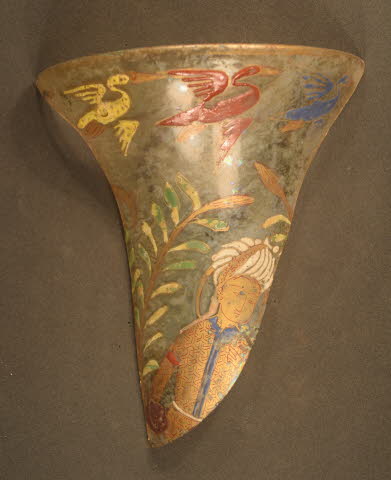 Beaker (fragment); clear colourless glass with red, yellow, blue, green enamelled and gilded decoration; representing a turbaned figure surrounded by vegetal sprays; with a row of birds along the top.