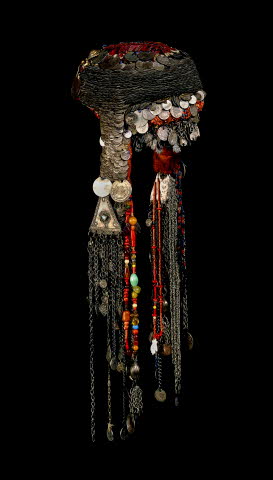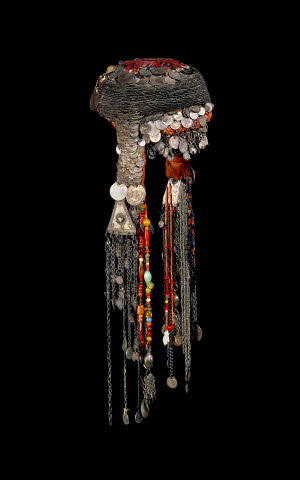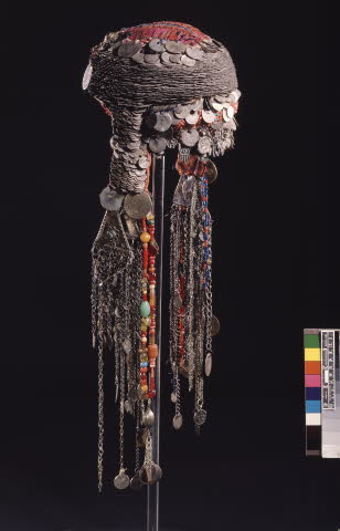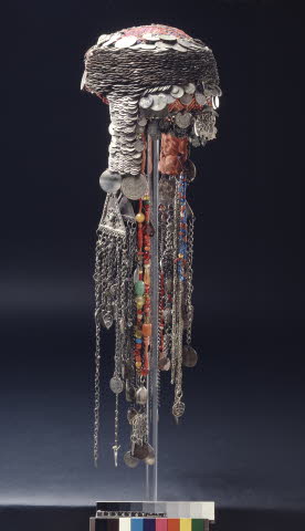 Bridal headdress or married woman's hat, made of blue and brown cotton; embroidered; red satin lining; coins and coral attached.