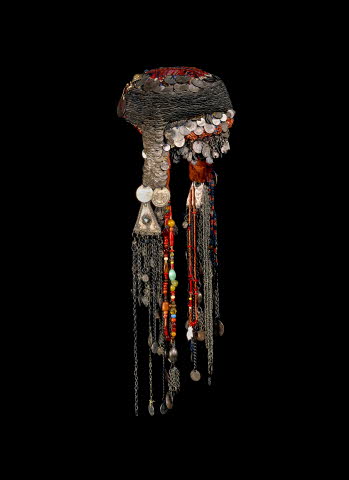 During the 1800s and early 1900s, brides in the villages of the Hebron hills wore a ceremonial headdress called a 'wuqayat al-darahim' (‘money hat’). With its densely-packed rows of Ottoman coins and numerous beads, charms and pendants, the headdress shielded a bride from the ‘eye of envy’ when she was most vulnerable – on procession to her new home and at her second public appearance celebrating the consummation of the marriage known as the ‘going out to the well’ ceremony.