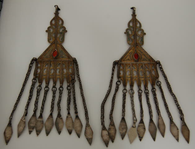 Pair of flat triangular-shaped silver temple pendants, known as tenechir. Each triangular pendant has at its centre a set oval cabochon carnelian and has gilt floral decoration. Each has openwork decoration above and below the triangular element and has nine chains hanging from loops terminating in plain undecorated lozenge shapes.