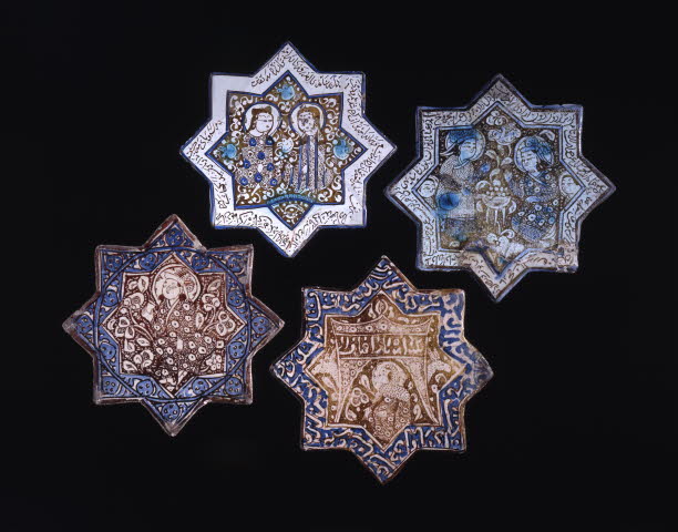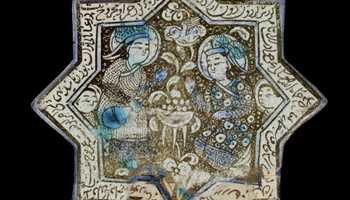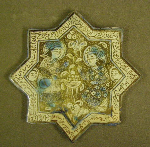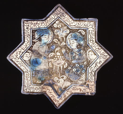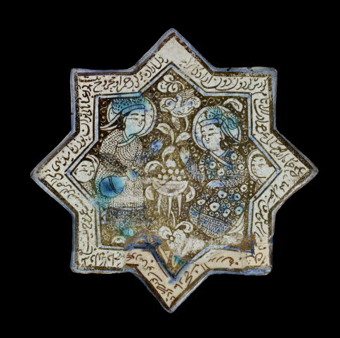 Eight-pointed star tile, repaired with a fragment of another tile. Fritware (stonepaste), painted in blue, turquoise and lustre over an opaque white glaze. The central field is et in the open, with flowers, foliage and a plump bird. It depicts a seated figure and a second, stooping, figure who is pouring wine from a bottle into an open bowl supported on a tripod. Both are wearing richly patterned tunics with hats with back flaps and feathers. Two smaller faces behind probably represent attendants. The inscription around the border contains a number of elements: verses of Persian poetry, a statement that it was made in Kashan and the date are followed by a phrase in Arabic. The lower right edge has been broken off and replaced by a fragment of another tile showing the beginnings of a verse from the Shahnameh.