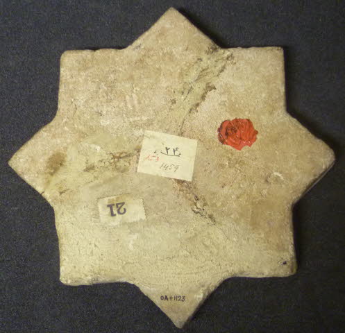By the thirteenth century glazed tiles were widely used in Iran to decorate the facades and interiors of both religious and secular buildings. In addition to monochrome glazed tiles, lustre star and cross tiles enjoyed increasing favour from the beginning of the thirteenth century well into the next century. In mosques, mausolea and religious schools ('madrasas') the Muslim injunction against the use of human imagery resulted in star tiles with non-figurative decoration and borders of Qur'anic inscriptions. By contrast, tiles with human and animal figures and well-known verses from Persian literature adorned the interiors of secular buildings. The general theme of a number of tiles from the British Museum collections produced in Kashan at the end of the 13th century is epicurean pleasure, such as romance (1878.1230.561), eating (OA+. 1123) and drinking (G.229). On the reverse of this object is a rectangular paper label which reads '21', printed in black with a larger paper label reading '24' written in black ink in Persian numbers, '153' written in red ink and '1459' written in pencil. The objects furthermore has a red seal.